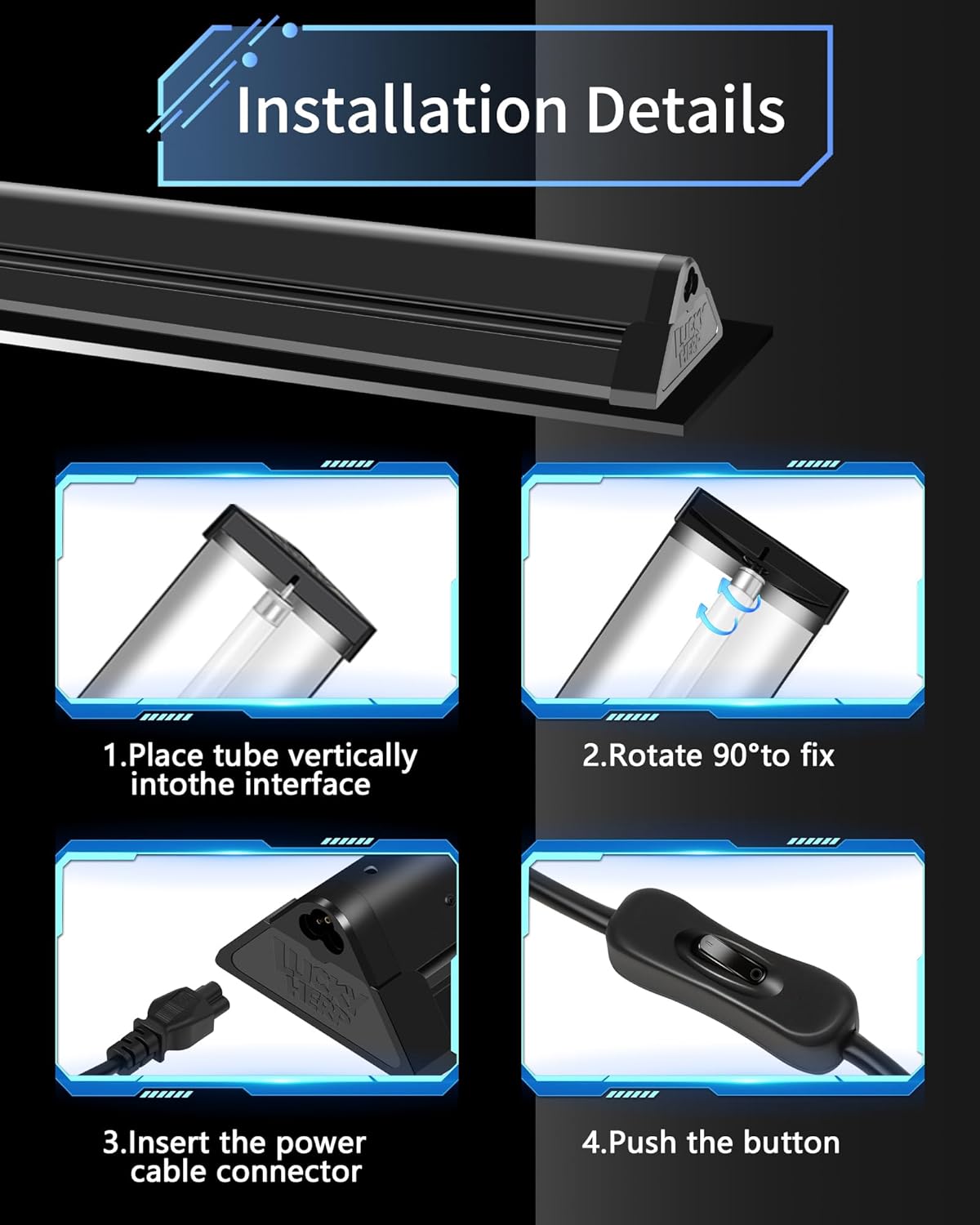 - Easy to Install & Safety – Plastic protective covers are attached to both ends of the reptile light fixture, adding flame retardant materials to ensure safety. The detachable power cable is easy to carry and install, and various mounting accessories allow the T5 uvb reptile light fixture to easily fit on a wire mesh or terrarium, and It can also be mounted on wooden tank with screws. We are equipped with a detailed instruction manual for your reference