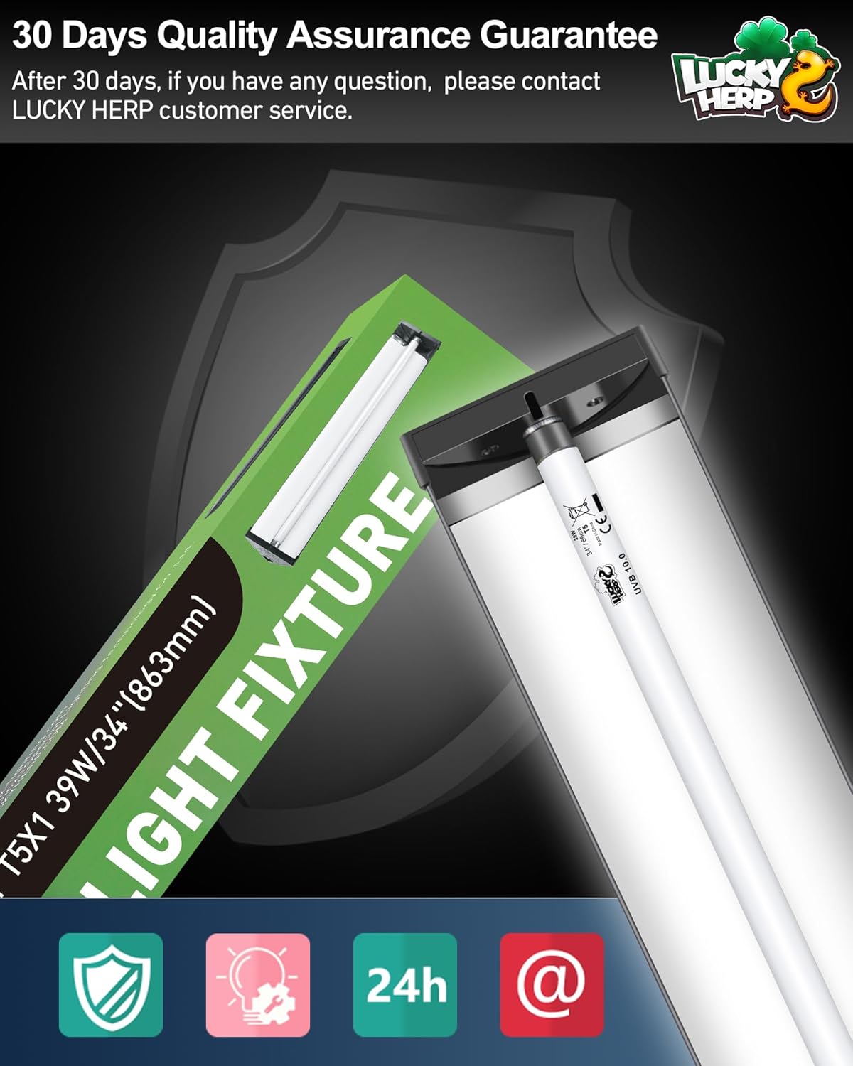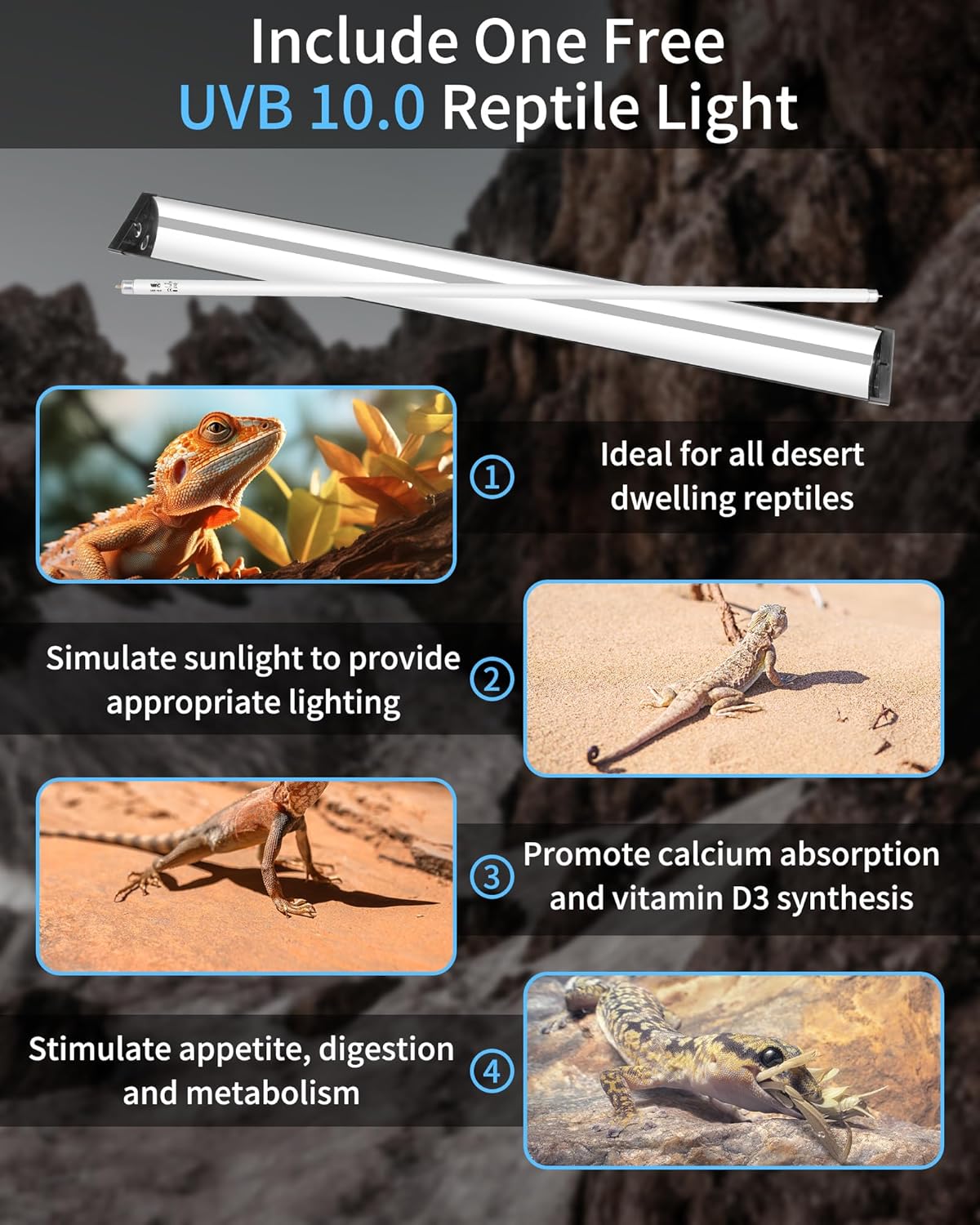 - T5 UVB Lighting Combo Kit – One purchase to meet the lighting needs of your reptile pets. We have carefully matched high-quality T5 reptile light fixture with 10.0 uvb reptile light to provide a perfect lighting environment for your reptile pets. Not only can it maintain the healthy growth of reptile pets, but also stimulate their physical behaviors such as appetite, activity level and reproduction.